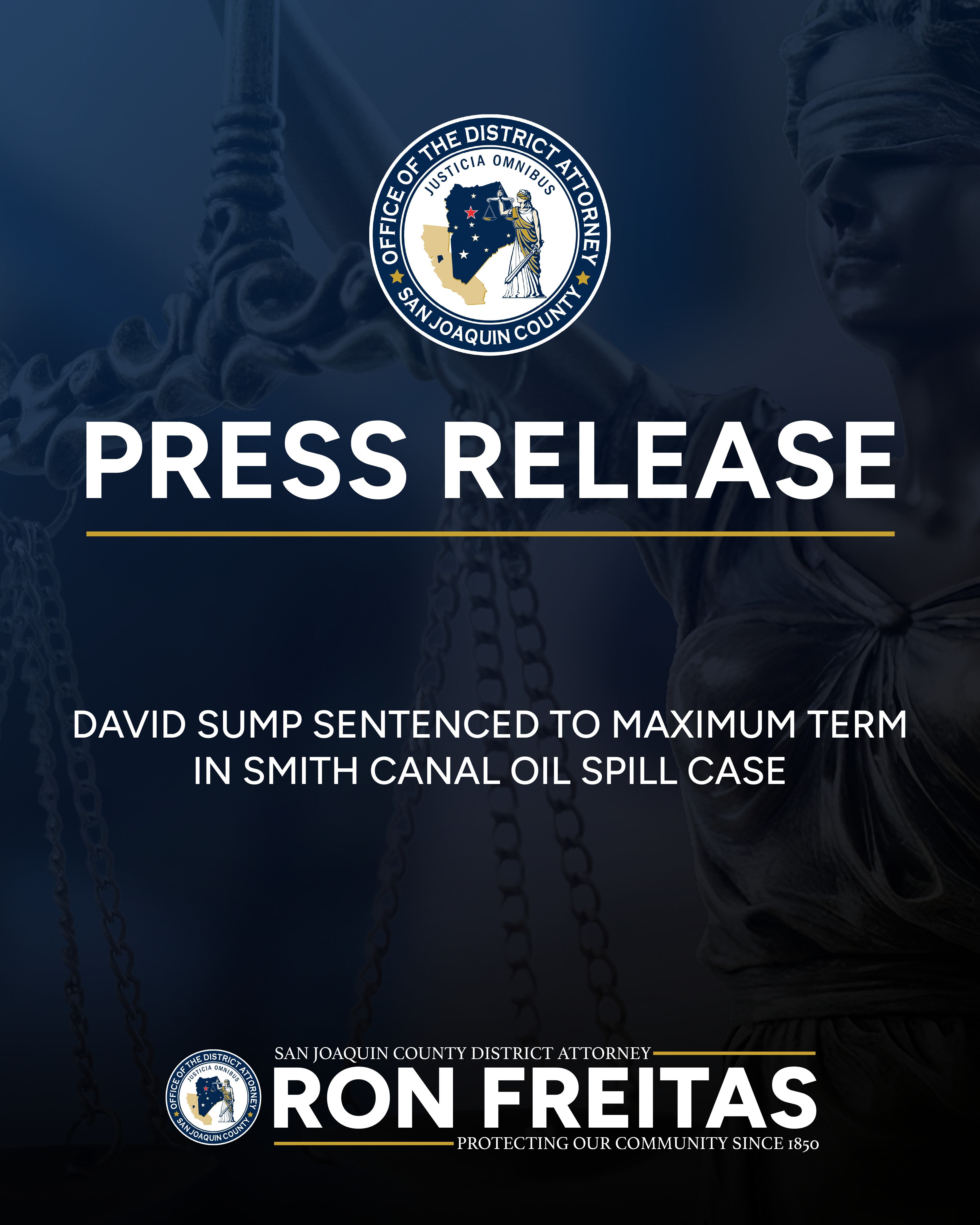 San Joaquin County District Attorney Ron Freitas announced today that defendant David Sump has been sentenced to the maximum term of six years in state prison for his role in the Smith Canal oil spill.