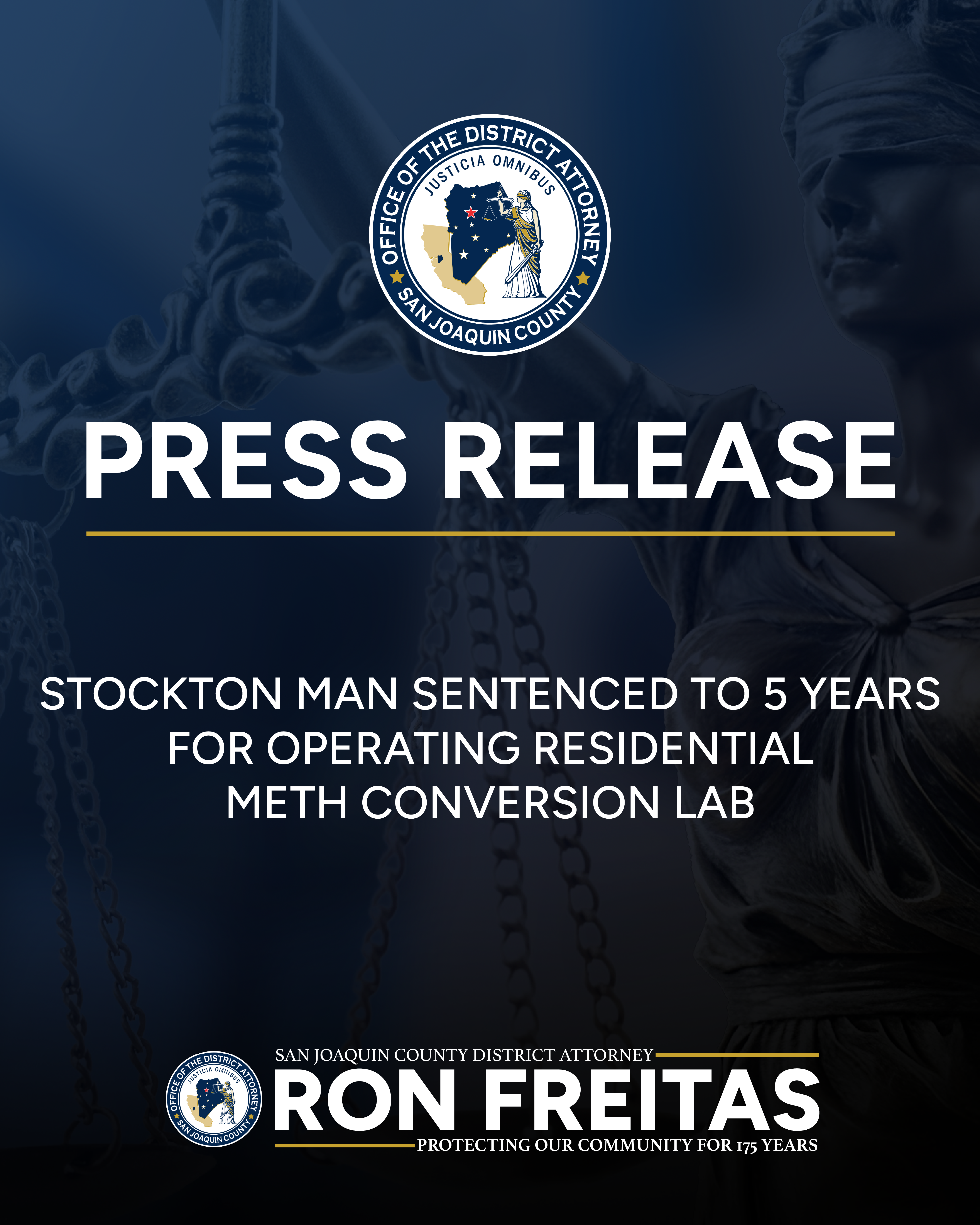San Joaquin County District Attorney Ron Freitas announced today that Jose Andres Garcia-Soto has been sentenced to five years in state prison following a major METRO Task Force operation that uncovered a conversion lab and 20 pounds of crystal methamphetamine in a residential neighborhood.