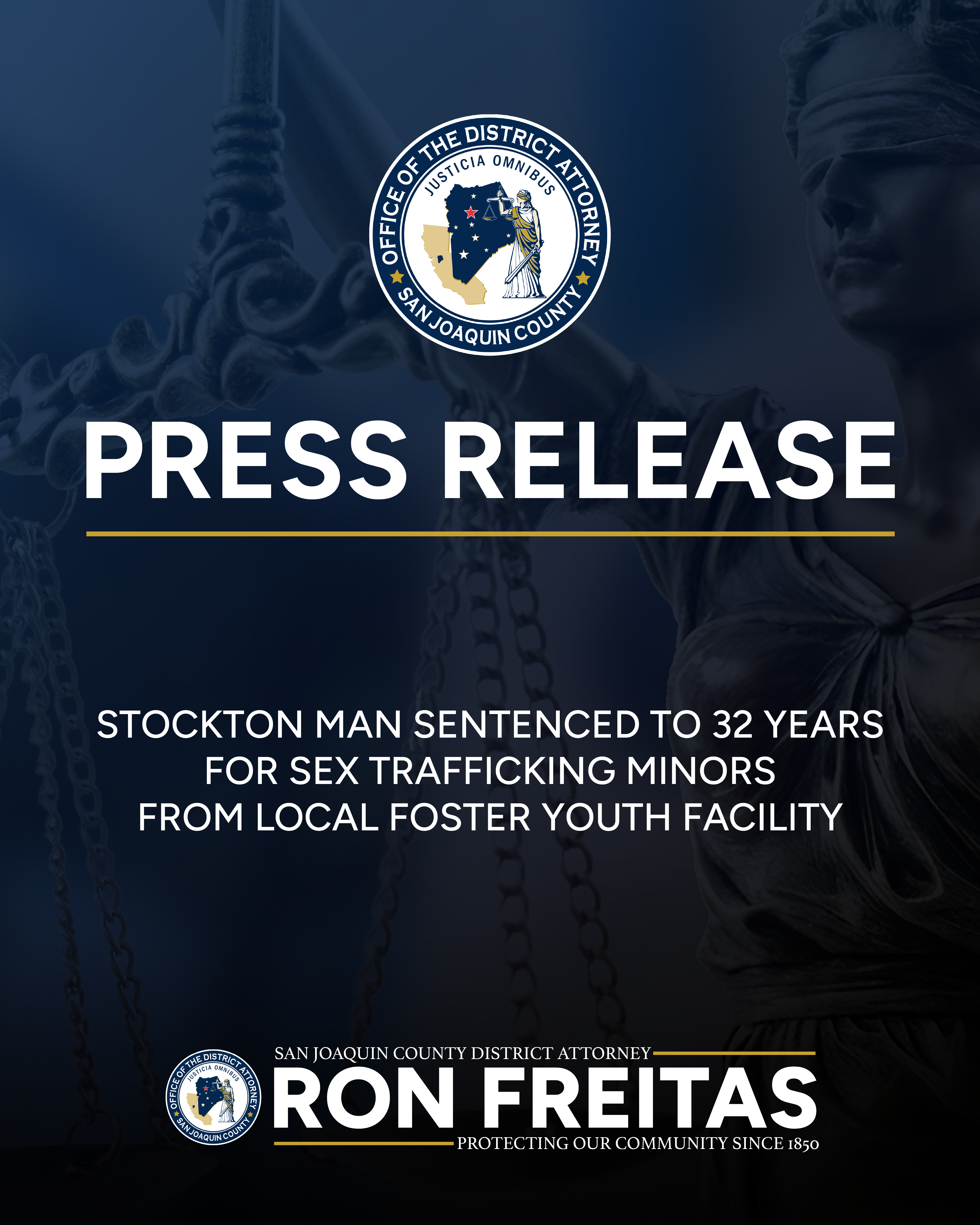San Joaquin County District Attorney Ron Freitas announced today that a 29-year-old Stockton man has been sentenced to 32 years in state prison for the sex trafficking of multiple minors from a local foster youth residential facility. In addition to his prison term, the defendant will be required to register as a sex offender under Penal Code 290 for the rest of his life.