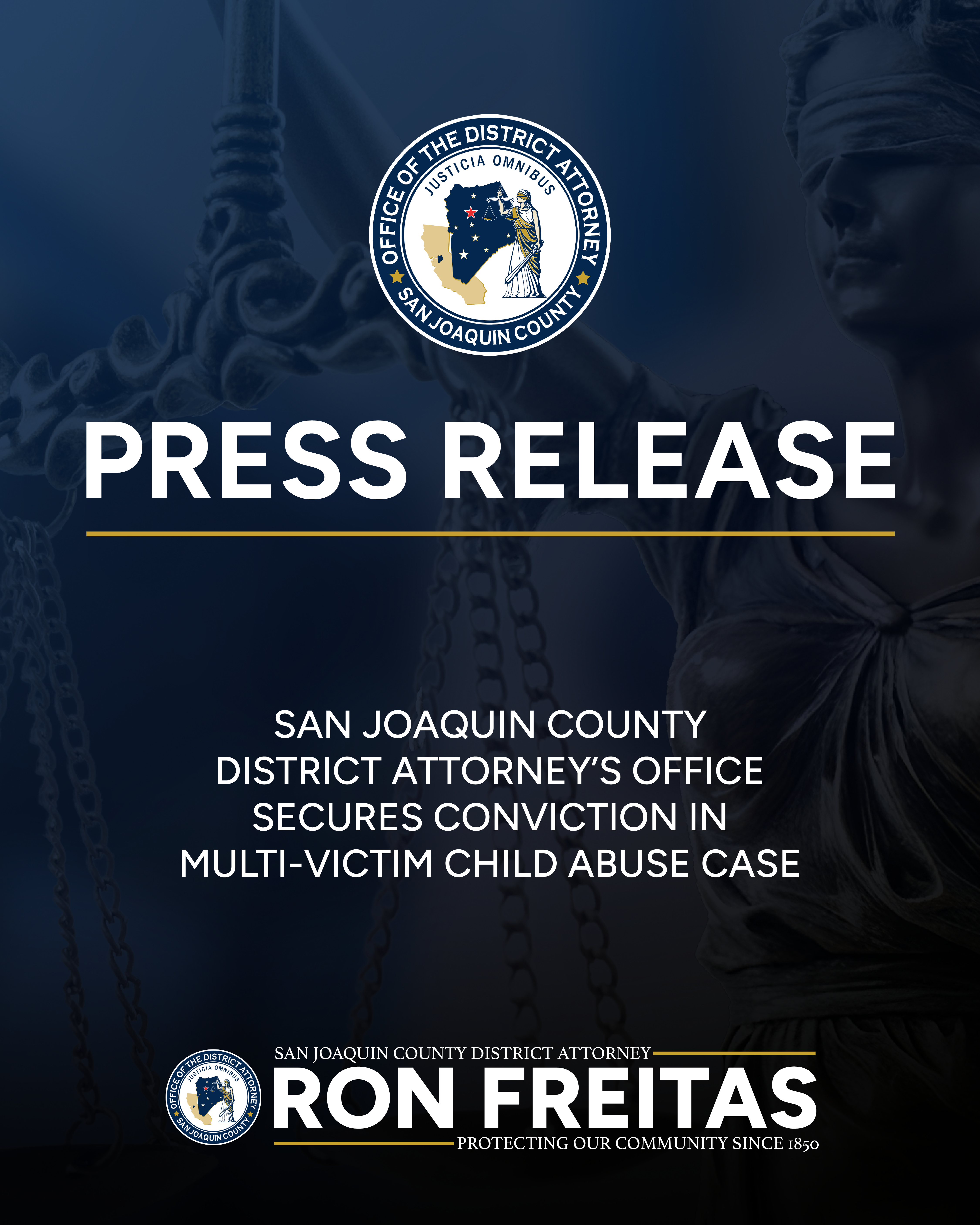 "To the survivors who stood up in that courtroom: your courage is the reason a predator is off our streets today," said District Attorney Ron Freitas. "There is no greater betrayal than a man who uses the sanctuary of a home to harm a child. My office is here to be a voice for the vulnerable and a shield for our youth. We will continue to stand firmly against those who steal the innocence of our children, ensuring they face the full weight of the law. Today, the justice you deserve has finally been served."